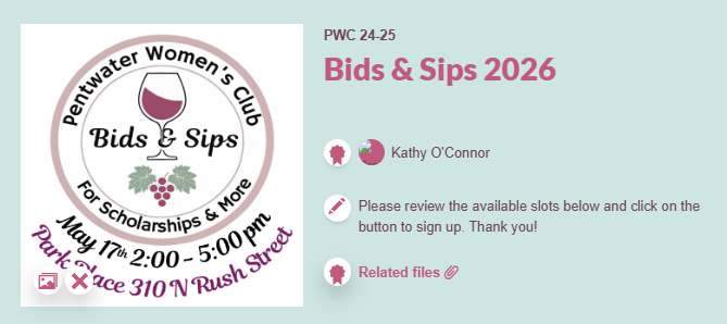 Bids & Sips Sign-upClick on one of the images below to be redirected to the Sign-Up Genius page. Volunteer for a Bids & Sips Task Sign-Up to Contribute a Food Item